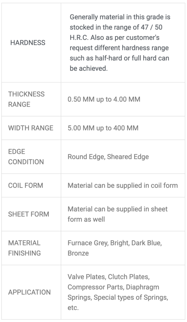 Generally material in this grade is stocked in the range of 47 / 50 H.R.C. Also as per customer's request different hardness range such as half-hard or full hard can be achieved.